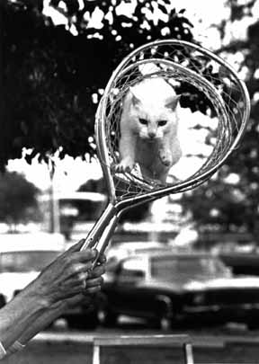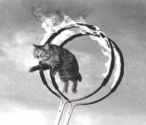 The "lions," of course, are his tiny domestic cats, with names like Sara, Sharky, and Piggy. Together·, Dominique and his kitties offer a unique show that's as sensational as it is silly. Sometimes the cats charge out of their cages, then leap up to Dominque's tall circus stands, or onto the Frenchman himself. Sometimes they execute jumps, skips, and turns, or leap through flaming hoops, eliciting ooohs and aaahs from the packed circle of onlookers. Sometimes the cats do absolutely nothing at all. In which case, Dominique, a well-seasoned ham with a flair for theatrics, performs figurative headstands while waiting for them to do their stuff.
